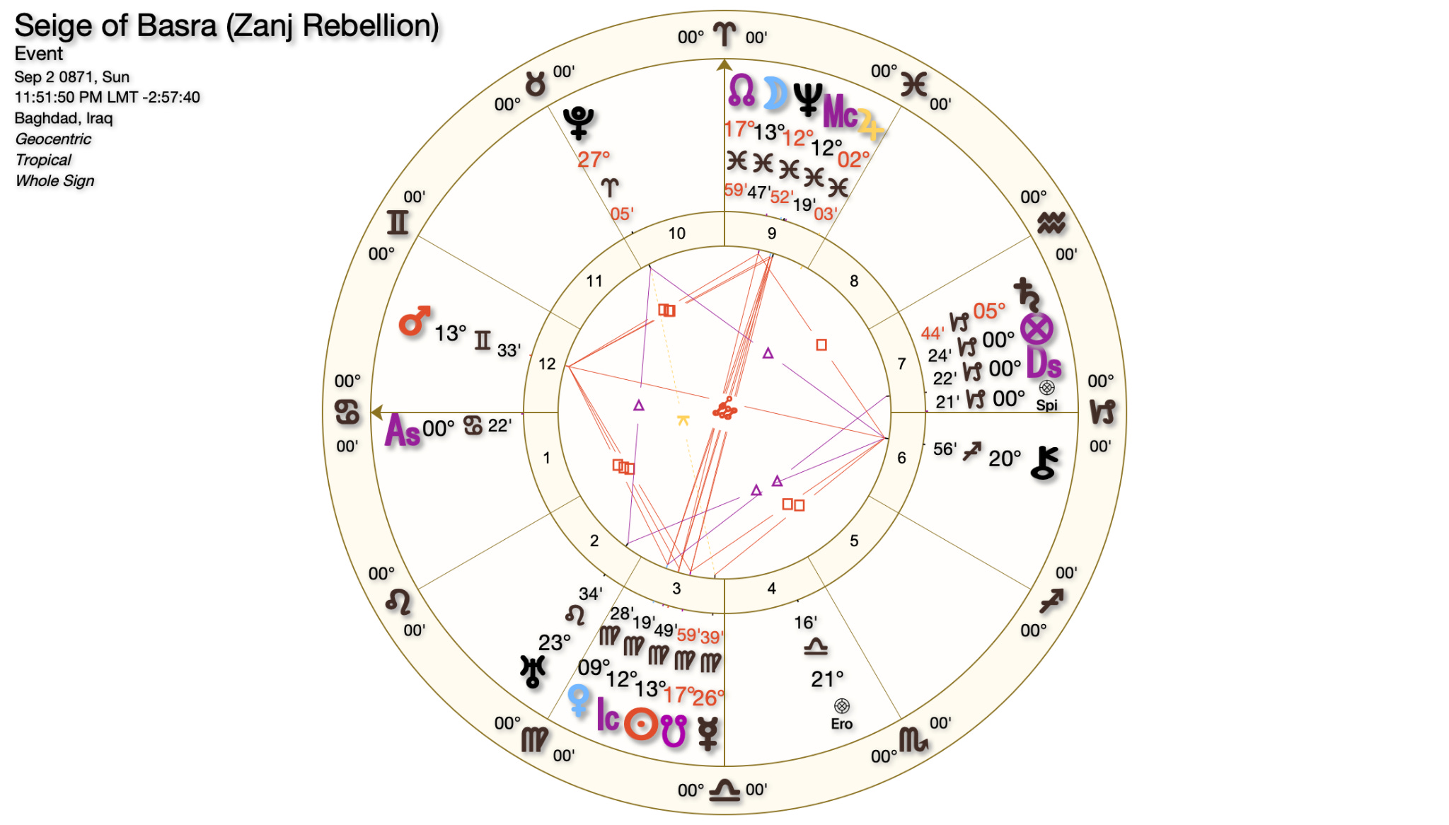 One of the reasons I have decided to spend more time with the Zanj Rebellion, is how close by degree tomorrow’s eclipse is with this lunation from 1,154 years ago. It is very rare that the sky mirrors, even partially, almost to the degree. And while there are some notable differences in rulership and co-present planets, it is special nonetheless and worth an extended aside. The defined start of the 15 year rebellion, is known as the Siege of Basra. Below is the chart, alongside this weekend’s eclipse chart.