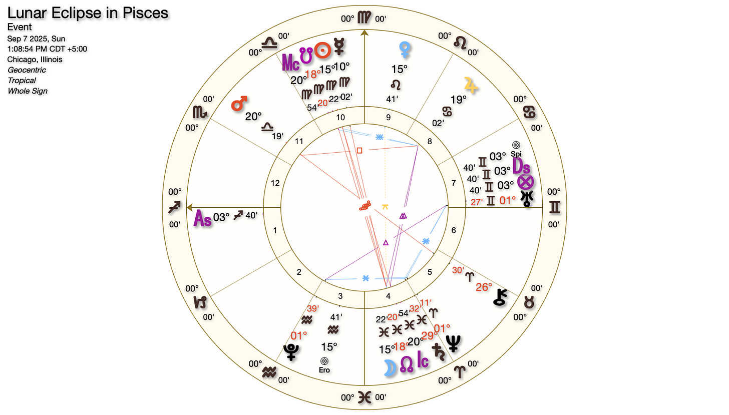 Sunday’s eclipse chart has an ascendant that matches up with the birth chart of the United States, albeit the eclipse is not visible here. Typically, where an eclipse is visible things tend to unfold. However, in this chart, it presents the nation with a combust profection ruler and is also in the profected house. I personally believe this speaks to a reorganizing of the global landscape politically and economically, given the unpredictable chaos that has unfolded since the beginning of the Trump administration. What I will point to is Uranus in Gemini reflecting the onset of techno-fedualism and the algorithmically controlled models of economic prediction that monopolize all cultural products, surveil and capitalize off of disaster and catastrophe. What does this mean as the world begins to look at the US as less of a dependable ally and more of a liability? Mercury, ruling the 10th house of the nation’s leader and its reputation as well as the 7th house of foreign enemies marks a stronger pivot given the diminishing esteem of US hegemony. And it also reflects the ostensible leadership of the Emperor, in his new clothes, as exalted planets are sometimes only exalted by their own self delusion rather than the merit of their abilities.